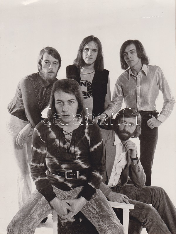 A Metro együttes zenekari portréja, hangszerek nélkül. Készült 1970-ben, a zenekar második klasszikus felállásában: Brunner GyÅ‘zÅ‘, Frenreisz Károly, Sztevanovity Dusán, Sztevanovity Zorán, Fogarasi János. Ismeretlen művész alkotása. Vintázs, ezüst nagyÃtású felvétel, mérete: 238x177 mm egy 242x182 mm méretű kartonlapra ragasztva. Az 1961-ben megalakult Metro együttes legnagyobb sikereit számos tagcsere után, 1970-1972-ben aratta. Fényképünk a zenekart második klasszikus felállásában mutatja be. Tagok: Brunner GyÅ‘zÅ‘ (dob), Frenreisz Károly (basszusgitár, szaxofon), Sztevanovity Dusán (ritmusgitár), Sztevanovity Zorán (ének, gitár), Fogarasi János (billentyű, ügynöki jelentések). A zenekarvezetÅ‘ Zorán elÅ‘téri hangsúlyos szereplése a fotón mindenképpen érthetÅ‘, mellette a zenekarhoz frissen csatlakozott Fogarasi János billentyűs látható. Bár Fogarasi János csupán egy évig, 1970-1971 során volt a zenekar tagja, jó kapcsolatai miatt neki köszönhetÅ‘ a magyar könnyűzene elsÅ‘ koncertalbumának, az ,,Egy este a Metro klubban..." cÃmű albumnak szokatlanul jó minÅ‘ségű felvétele és kiadása. Egy évvel késÅ‘bb Fogarasi János visszatért a jazz világába, Frenreisz Károly pedig a Locomotiv GT-be távozott, az együttes 1972-ben feloszlott. Jó állapotú fotó.