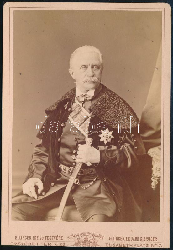 1887 Kellemesi Melczer István (1810-1896), az utolsó királyi személynök, 1848-ban Pesten nemzetőr, főrendiházi tag portréja díszkarddal, kitüntetésekkel dekorált (többek közt Magyar Királyi Szent István-rend), hátoldalán Melczer István autográf dedikációjával és datált, keményhátú fotó Ellinger Ede és Testvére műterméből, alja vágott, 16x11 cm