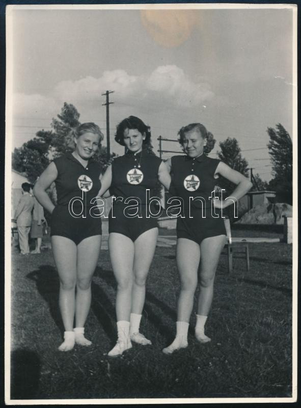 1954 Tornászlányok, vörös csillagot és buszt ábrázoló csapatcímeres fe... https://www.darabanth.com/en/466-Online-auction/466.0/Art-and-other-collectibles/Photo~23/1954-Tornaszlanyok-voros-csillagot-es-buszt-abrazolo-csapatcimeres-felsoben-BKV-csapat~II3149973