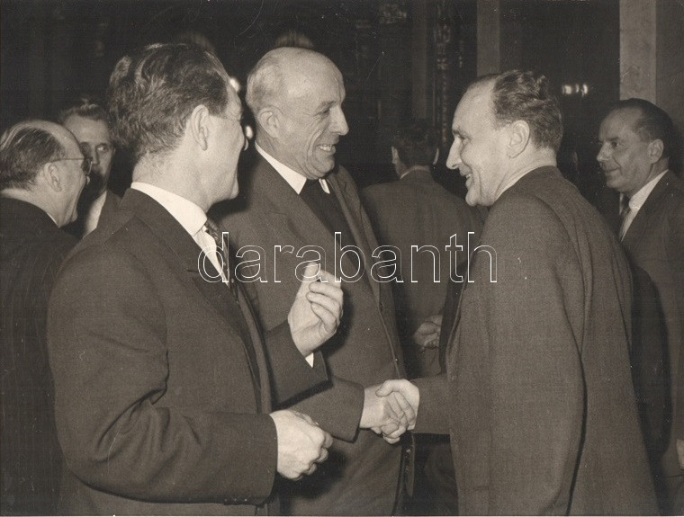 Kádár János kezet fog Beresztóczy Miklós címzetes préposttal, az Országos Béketanács elnökségi tagjával. Készült a Parlament folyosóján, 1960 decemberében. Farkas Tibor felvétele. Vintázs, ezüst nagyítású felvétel, mérete: 130x170 mm, hátoldalán feliratozva. A Parlament folyósóján kezet fog a pálya csúcsára érkezett két egykori bebörtönzött: Kádár János (MSZMP Központi Bizottság, első titkár) és Beresztóczy Miklós (címzetes prépost, békepap, politikus). A katolikus egyház által prépostként soha el nem ismert Beresztóczy Miklós 1953-tól az állampárt országgyűlési képviselője volt, 1961-től az Országgyűlés alelnöki pozícióját töltötte be. Kádár Jánostól jobbra, a háttérben Fock Jenő, az MSZMP KB titkára, az Új Gazdasági Mechanizmus későbbi kidolgozója. A fotó megjelent az Ország-Világ hetilap 1960. évi 50. számának 2. oldalán (1960. december 14). Jó állapotú fotó.