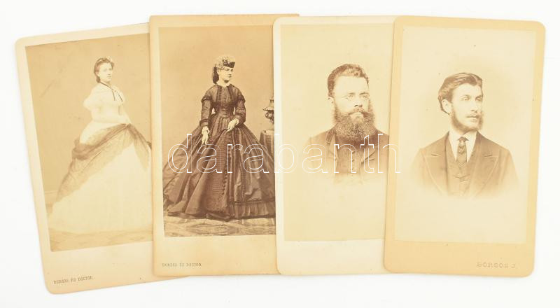Description: cca 1860-1865 Borsos és Doctor, valamint Borsos József pesti műtermében készült 4 db vizitkártya méretű portréfotó, 2 női, 2 férfi, az egyik verzóján kétfejű sasos, koronás nemzeti címerrel, 10x6 cm.