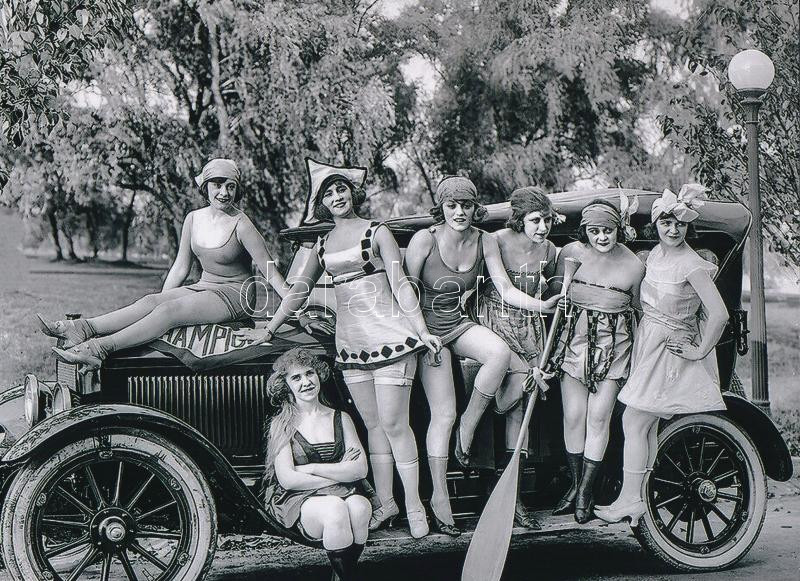 cca 1910 Fürdőrucis lányokkal díszített automobil, 1 db modern nagyítá...