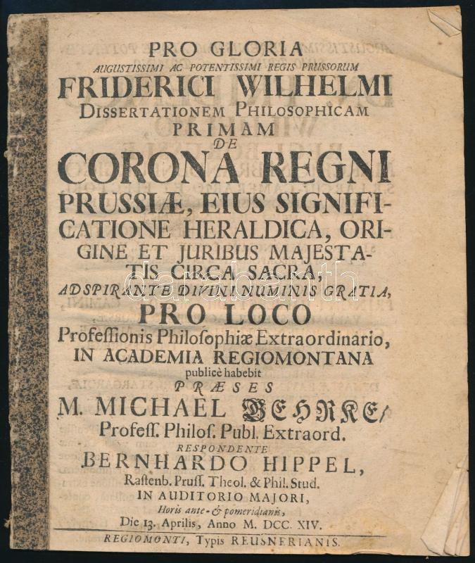 1714 Pro Gloria augustissimi ac potentissimi regis prussorum Friderici Wilhelmi dissertationem philosophicam primam de Corona Regni Prussiae, eius significatione heraldica, origine et juribus majestatis circa sacra, adspirante divini numinis gratio, pro loco professionis philosophiae extraordinario in Academia Regiomontana publicé habebit praeses M. Michael Behkre profess. philos. pub. extrord. respondente Bernhardo Hippel, ... Regiomonti, 1714, Typis Reusnerianis, 2+14 p. Latin nyelven.