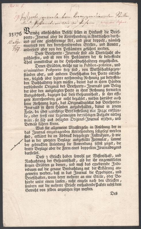 1789 Buda, gróf Zichy Károly (1779-1834) fősipán által kiadott rendelet a hivatalos levelezések adminisztrálása tárgyában