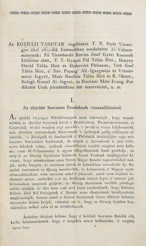 1851 Az Egyházi Tárgyak visgálására T. N. Győr Vármegye által 18[51]-dik esztendőben rendeltetett al-választmánynak: fő tisztelendő Kováts József győri kanonok elölölülése alatt, T. T. Gyapai Pál tábla bíró, Henyey Dávid tábla bíró, a' Nev. Papság' all-igazgatója és választmány jegyző, Maár Bonifatz tábla bíró és K. Oktató, Balogh Kornél al-jegyző, és Haubner Máté evang. prédikátor urak jelenlétökben tett észrevételei, u. m. ... Kiadtam Schedius Kristóf megyebéli hites jegyzö, h.n., ny. n. 8 p.