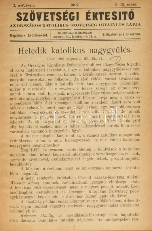 1907-1908 Szövetségi ÉrtesÃtÅ‘, az Országos Katolikus Szövetség hivatal...