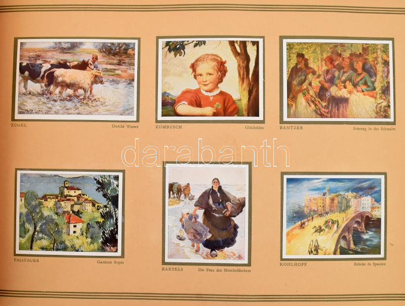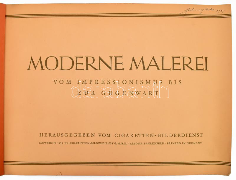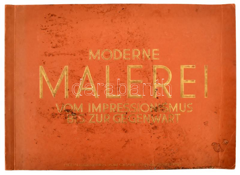1933 Moderne Malerei vom Impressionismus bis zur Gegenwart. Altona-Bahrenfeld, 1933, Cigaretten-Bilderdienst G.m.b.H., 55+(1) p. A modern festészetet bemutató német cigarettakép-gyűjtőalbum. Komplett, az összes kép beragasztva! Kiadói harántalakú papírkötés, kissé viseltes, foltos borítóval, belül jó állapotban, 29x40 cm.