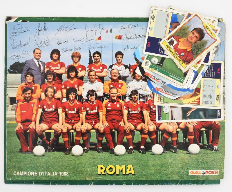 Description: 1990 Il Grande Calcio - Enciclopedia del calcio mondiale / Az 1990-es labdarúgó vb-ről szóló, olasz nyelvű képes kiadvány + vegyes olasz focis kártyák, valamint az AS Roma csapatát ábrázoló poszter, nyomtatott aláírásokkal