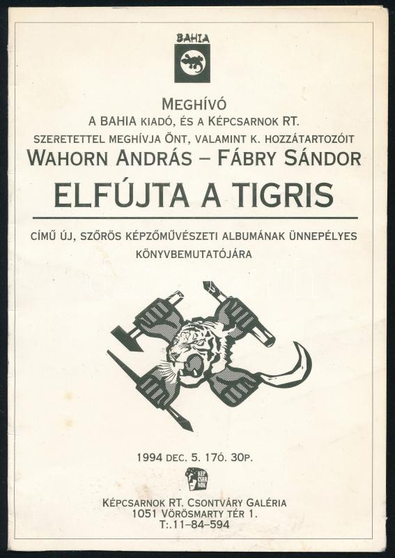 1994 Wahorn András - Fábry Sándor Elfújta a Tigris c. képzőművészeti albumára szóló meghívó