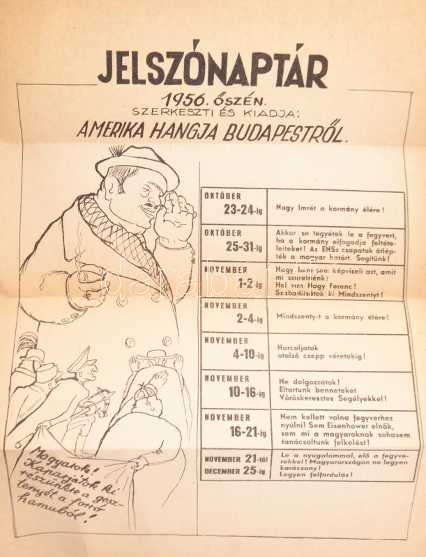 Description: Jelszónaptár 1956. őszén. Szerk. és kiadja: Amerika hangja Budapestről. Gúnyos politikai propaganda plakát / röplap, szign.: Eszterházy, hajtva, 34,5x24,5 cm