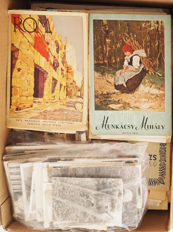 Közepes doboznyi vegyes papírrégiség, benne kb. 240 db fotó, Munkácsy könyv, sok képeslap, régi nyomtatványok, Róma útikönyv, néhány térkép, kiállítási katalógusok, újságok, stb.