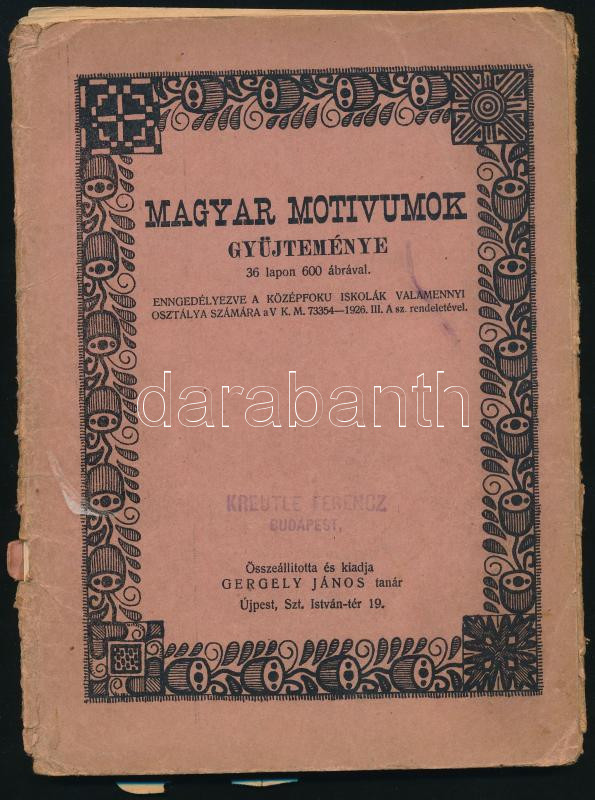cca 1927 Magyar motívumok gyűjteménye. 36 lapon 600 ábrával. Összeáll.... https://www.darabanth.com/en/466-Online-auction/466.0/Art-and-other-collectibles/Printed-Materials~500013/cca-1927-Magyar-motivumok-gyujtemenye-36-lapon-600-abraval-Osszeall-es-kiadja-Gergely-JC3~II3149660