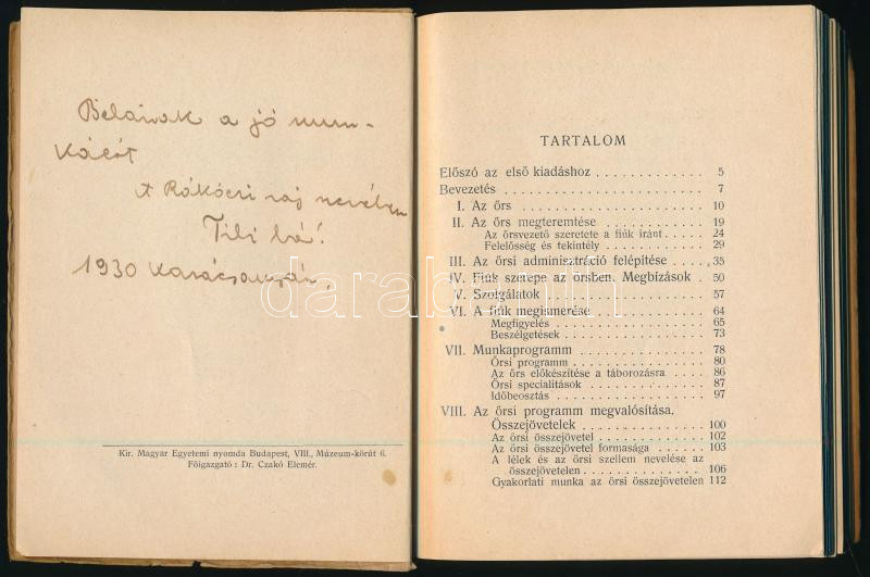 Description: Major Dezső: Cserkészőrsvezetők könyve. Magyar Cserkész Könyvei 9-13. sz. Bp., 1927, Magyar Cserkész-Szövetség, 276 p. Harmadik kiadás. Kiadói papírkötés, kissé foltos, sérült borítóval, ajándékozási bejegyzéssel.