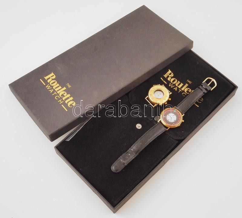 Fiorucci "The Roulette Watch" karóra pár. cca 1980, kvarc, pereménél pörgethető rolulette kerék résszel, 1 darab bőr szíjjal, díszdobozban, jó állapotban.