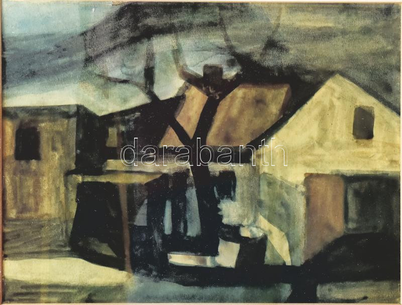 Gerő András (1936-): Falusi utca. Akvarell, papír, jelzés nélkül, hátoldalán Képcsarnokos etikett, raktári szám: 102. 24x31 cm, keretezett, üvegezett, sérült.
