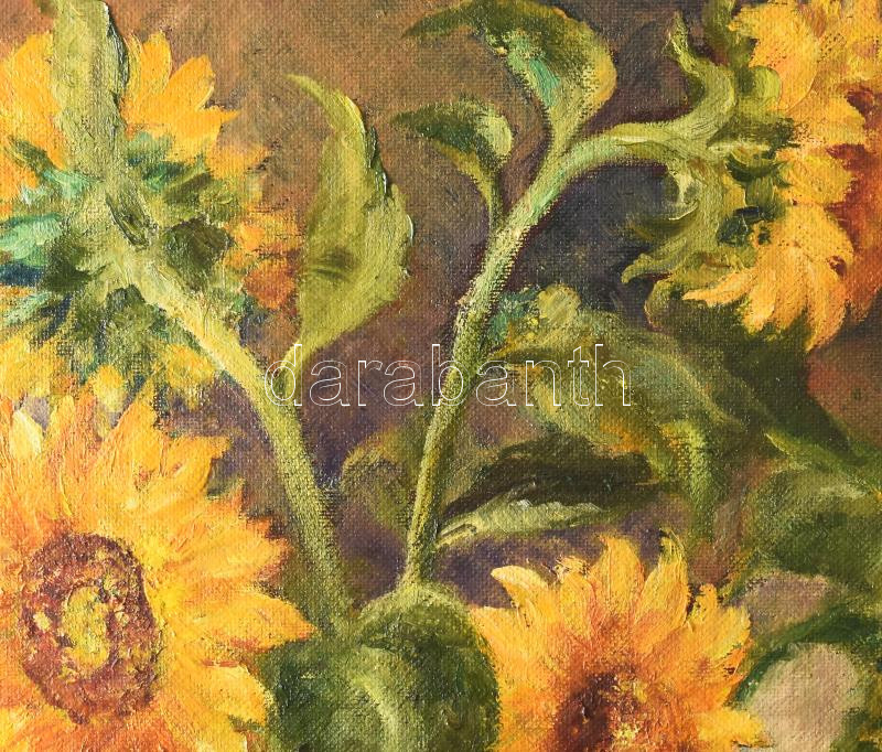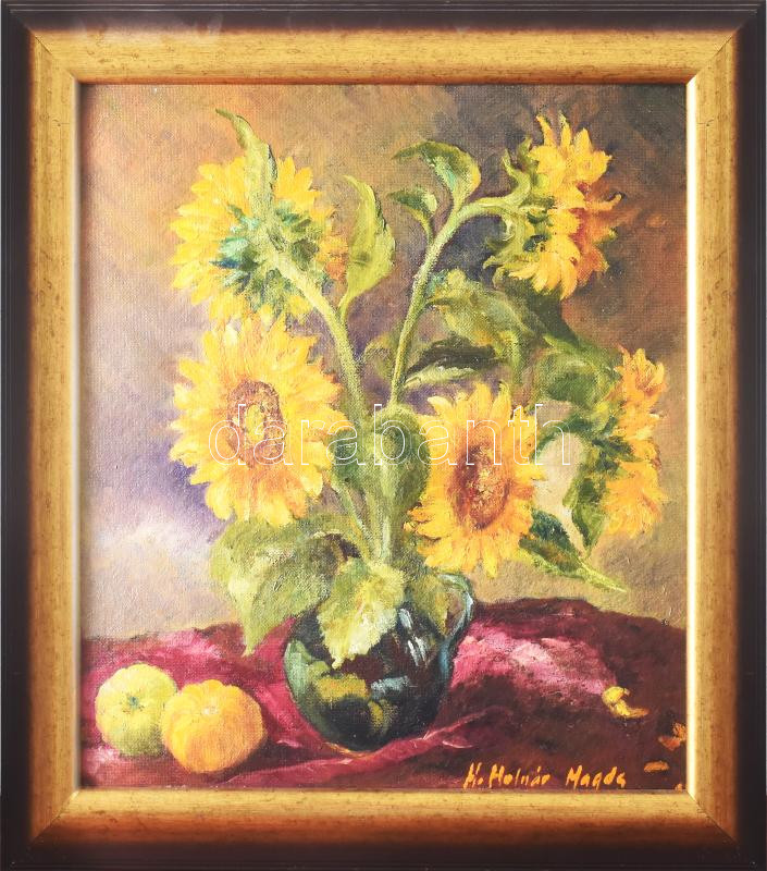 H. Molnár Magda (1935-): Napraforgó zöld korsóban. Olaj, farost, jjl.: H. Molnár Magda. 53x49 cm, keretben, jó állapotú.
