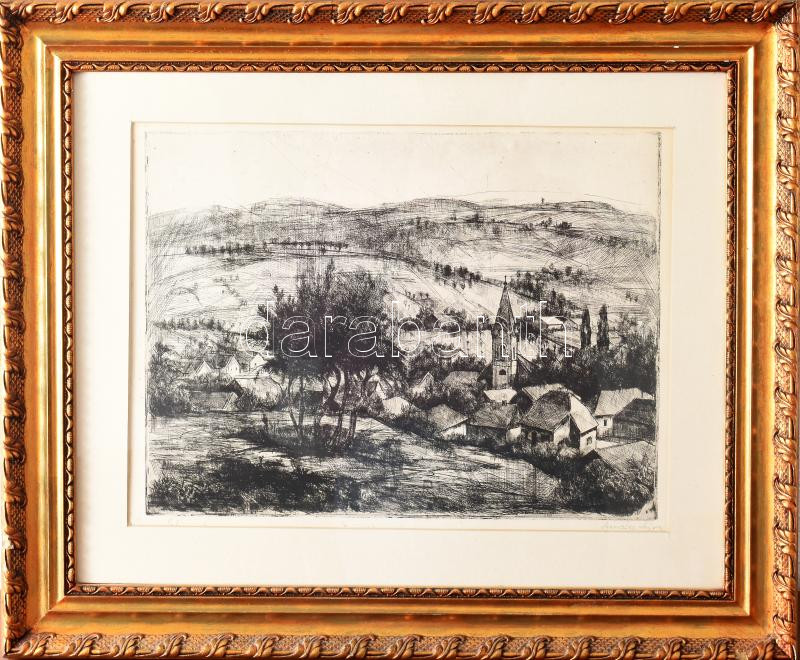 Mészáros Lajos (1925-1971): Ják. Rézkarc, papír, jjl.: Mészáros Lajos. 29,5x39 cm, keretben, üvegezett, sérült.