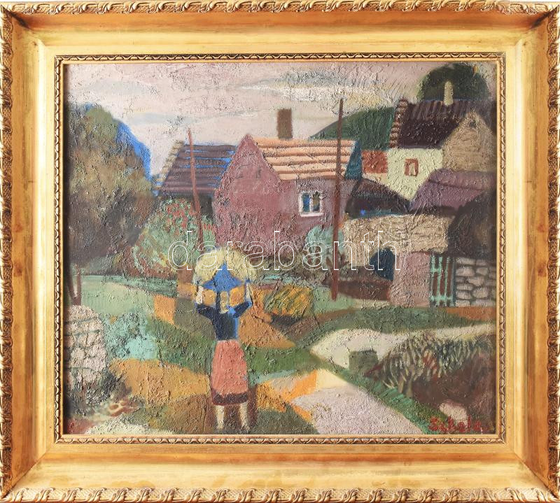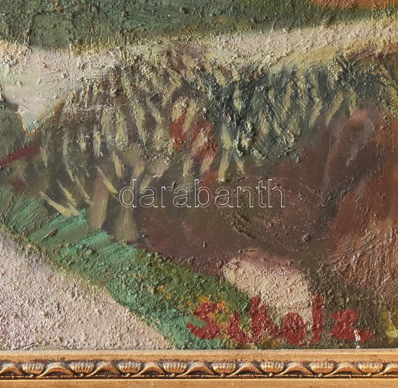 Scholz Erik (1926-1995): Falurészlet. olaj, farost, jjl: Scholz. 50x60 cm, keretben, jó állapotú.