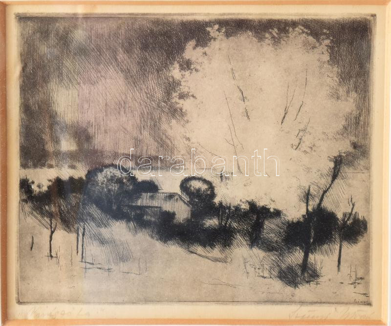 Szőnyi István (1894-1960): Virágzó fa. Rézkarc, papír. Jjl.: Szőnyi István; Jbl.: Virágzó fa. 20x24 cm, keretben, üvegezett, jó állapotú.