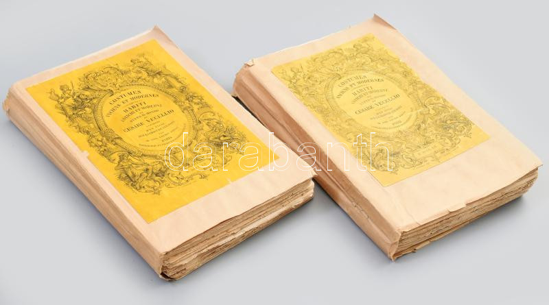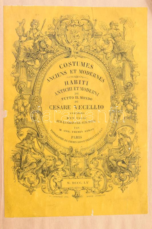 Cesare Vecellio: Costumes Anciens et Modernes. I-III. Habiti Antichi et Moderni di Tutto il Mondo di - - précédes d'un essai sur la gravure sur bois par M. Amb. Firmin Didot. Paris,1859-1860,Typographie de Firmin Didot Fréres Fils & C. Gazdag képanyaggal illusztrált (I. rész: 1-234, II. rész: 235-510.) Amatőr papírkötésben, de az eredeti borítók részben felhasználásával, széteső állapotban, hiányos: a 2. rész 510. táblával végett ér, de 513 táblának kellene lennie.