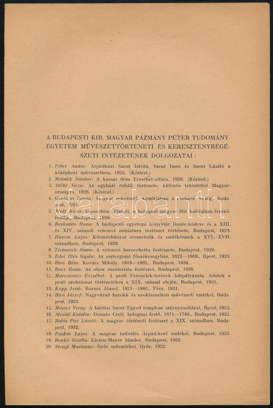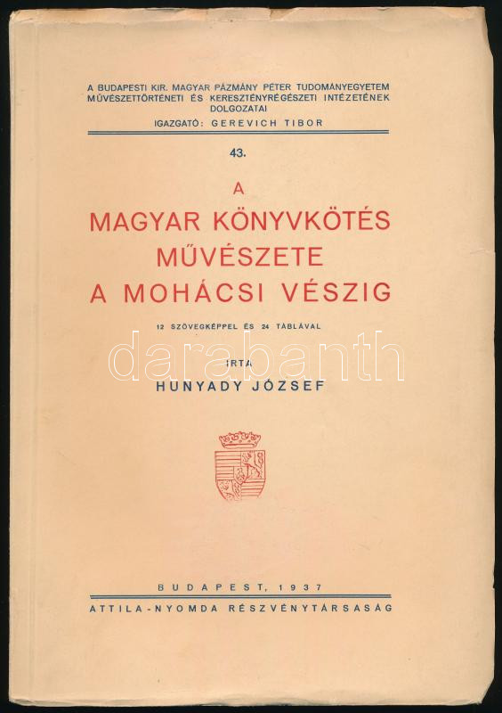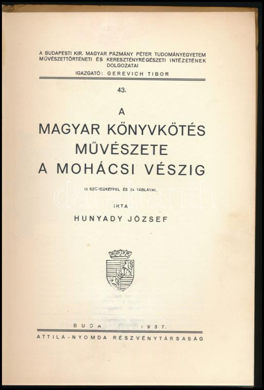 Hunyady József: A magyar könyvkötés művészete a mohácsi vészig. 12 szövegképpel és 24 táblával. A kötet végén: A könyvkötés irodalmának bibliográfiája 1935-ig.(59-109 p.) A Budapesti Kir. M. Pázmány Péter Tudományegyetem Művészettörténeti és Keresztényrégészeti Intézetének Dolgozatai 43. Bp., 1937, Attila Nyomda Rt., 111 p.+XXIV (fekete-fehér képtáblákkal) t. Kiadói papírkötés, a borító szélek apró szakadásaitól eltekintve szép állapotban. A végén kiadványjegyzékkel. Számozott, 67. számú számozott példány.