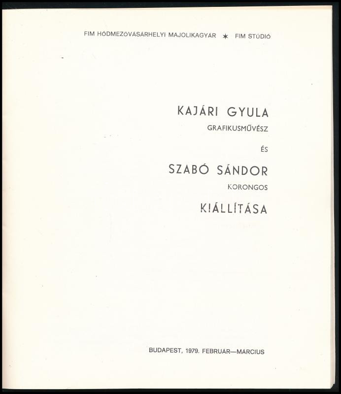 Kajári Gyula grafikusművész és Szabó Sándor korongos kiállítása. A kat... https://www.darabanth.com/en/466-Online-auction/466.0/Books/Books-Architecture-Art~500046/Kajari-Gyula-grafikusmuvesz-es-Szabo-Sandor-korongos-kiallitasa-A-katalogust-tervezte-Sz~II3145990