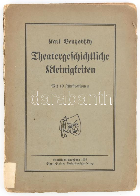 Karl Benyovszky: Theatergeschichtliche Kleinigkeiten. Bratislava/Pressburg (Pozsony), 1926, Sigm. Steiner. Német nyelven. Fekete-fehér illusztrációkkal. Kiadói papÃrkötés, sérült gerinccel és kötéssel.