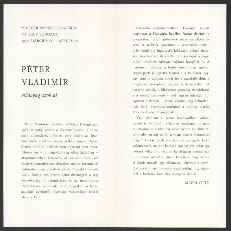 Péter Vladimir 3 db kiállítási katalógus-prospektus: Dorottya Galéria, 1997 + 1977 Képcsarnok + 1977 MNG Műhely sorozat.