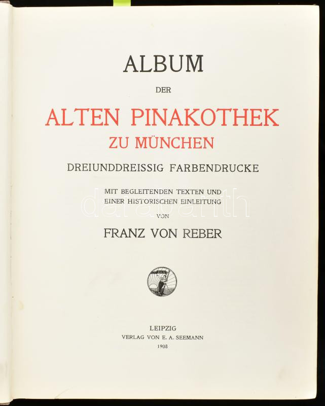 Description: Reber, Franz von: Album der Alten Pinakothek zu München. 33 Farbendrucke mit begleitenden Texten und einer historischen Einleitung von - - . Leipzig, 1908, E. A. Seemann. Gazdag egészoldalas, színes képanyaggal illusztrálva. Német nyelven. Kiadói aranyozott, dombornyomott egészvászon-kötés, nagyrészt jó állapotban, a címlapon kisebb szakadással.