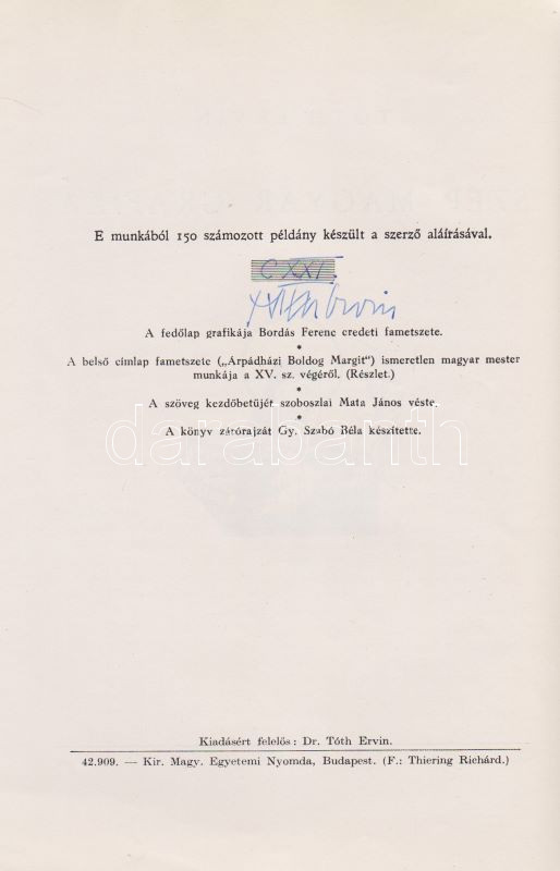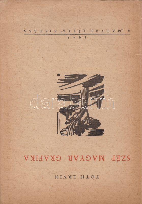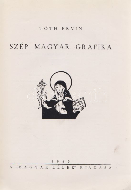Tóth Ervin: Szép magyar grafika. (Számozott, aláírt.) (Budapest), 1943. A ,,Magyar Lélek" kiadása (Királyi Magyar Egyetemi Nyomda). 24 p. Egyetlen kiadás. Kolofon: ,,E munkából 150 számozott példány készült a szerző aláírásával. CXXI. [példány]. Tóth Ervin (aláírás). A fedőlap grafikája Bordás Ferenc eredeti fametszete. A belső címlap fametszete, az Árpád-házi Boldog Margitot ábrázoló fametszet ismeretlen magyar mester munkája a XV. század végéről. A szöveg kezdőbetűjét szoboszlai Mata János véste. A könyv zárórajzát Gy. Szabó Béla készítette". Oldalszámozáson belül gazdag illusztrációs anyaggal. Fűzve, színes, illusztrált kiadói borítóban. Jó példány.