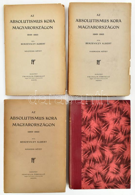 Berzeviczy Albert: Az absolutismus kora Magyarországon. 1849-1865. I-IV. köt. [Teljes]. Bp., 1922, Franklin-Társulat, 436 p.; 566 p.; 443+(1) p.; 106+(1) p. Első kiadás. Kiadói papírkötés (II-IV. köt.), ill. átkötött félvászon-kötés (I. köt.), változó, többségében jó állapotban, helyenként kissé sérült lapszélekkel, ceruzás bejegyzésekkel.