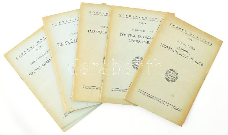 Description: Cobden-könyvtár 5 száma: Marczali Henrik: Cobden történeti jelentősége.; Dr. Gratz Gusztáv: Politikai és gazdasági liberalizmus.; Gróf Apponyi Albert: Társadalmi átalakulások.; Méhely Kálmán: A XIX. század öröksége.; Őrgróf Pallavicini György: A magyar agrárpolitikáról. Bp., [1921-1923], Magyar Cobden-Szövetség. Kiadói tűzött papírkötés.