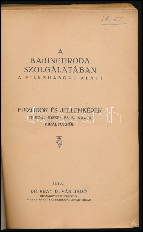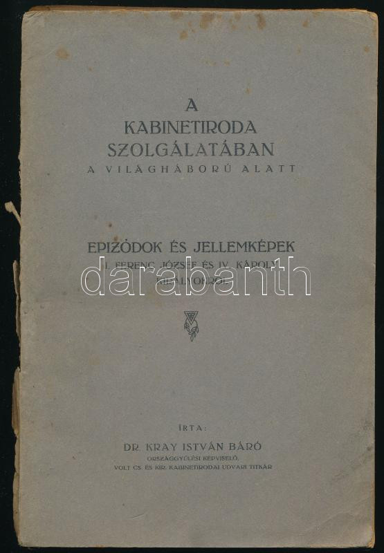 Dr. Kray István báró: A kabinetiroda szolgálatában a világháború alatt. Epizódok és jellemképek I. Ferenc József és IV. Károly királyokról. H.n., 1935, szerzői kiadás (Zalaegerszeg, Zrínyi-ny.), 157+(3) p. Kiadói papírkötés, kissé foltos, sérült, szétvált borítóval, szétváló fűzéssel.