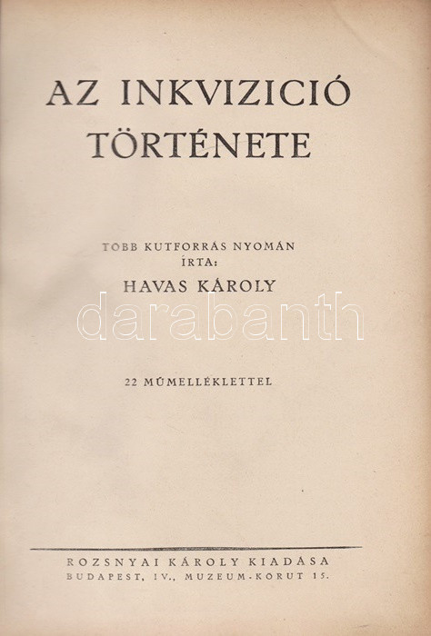 Havas Károly: Az inkvizíció története. Több kútforrás nyomán. 22 műmelléklettel. Budapest, (1927). Radnai Károly (Fővárosi Nyomda Rt.) 504 p. + 22 t. (Brenner Nándor illusztrációi). Első kiadás. Korabeli sajtóértesülések szerint a Havas (Handelsmann) Károly neve alatt megjelent kötet megjelenését megelőző hónapokban vidéki nagyvárosokban és falvakban intenzív ügynöki kampány zajlott, melynek eredményeképpen a tízezer példányban nyomott kötet első kiadása rendkívül hamar elfogyott. A szenzációs témát Brenner Nándor - olykor némi erotikát sem nélkülöző - festményei kísérik. A kötet utóéletéhez hozzátartozik a kötet plágiumpere, a munka ugyanis Henry Charles Lea századfordulón megjelent kötetének bővebb kivonatolása, az eredeti szerző nevének érdemi megjelenítése nélkül. (Esti Kurír, 1928. március 28.) Aranyozott, álbordázott, első kötéstábláján enyhén foltos kiadói egészvászon kötésben (Pegazus kötészet, Budapest).