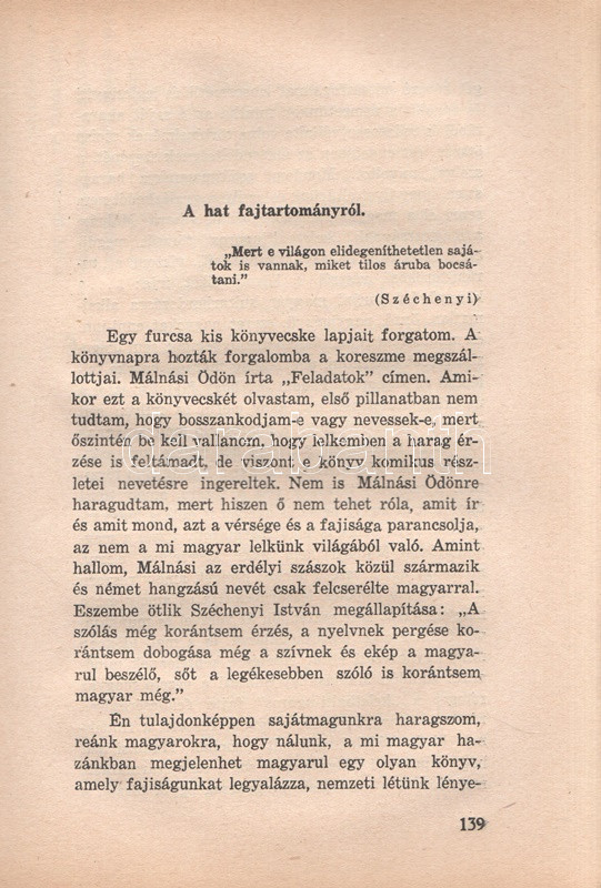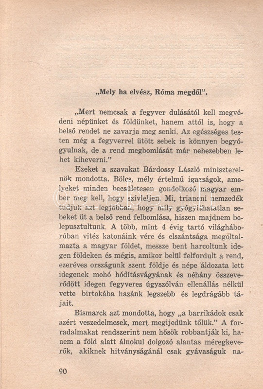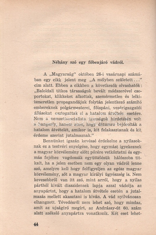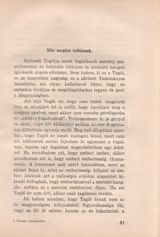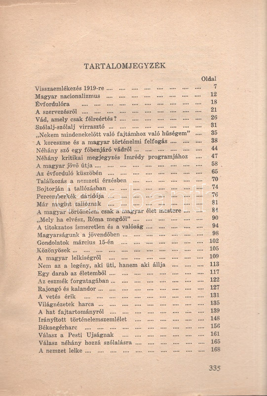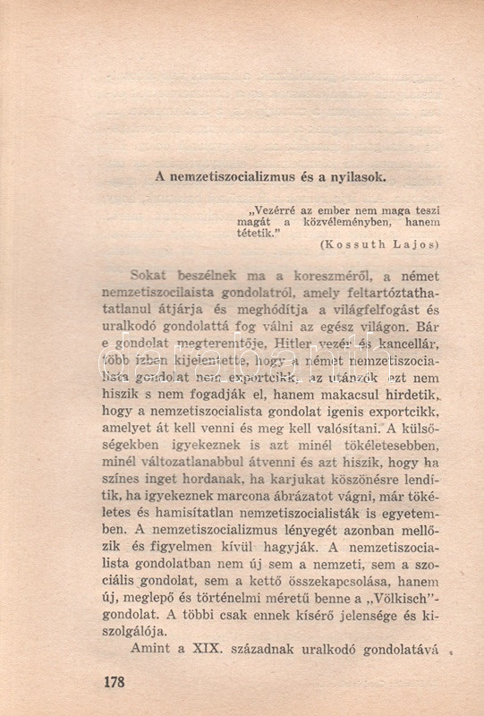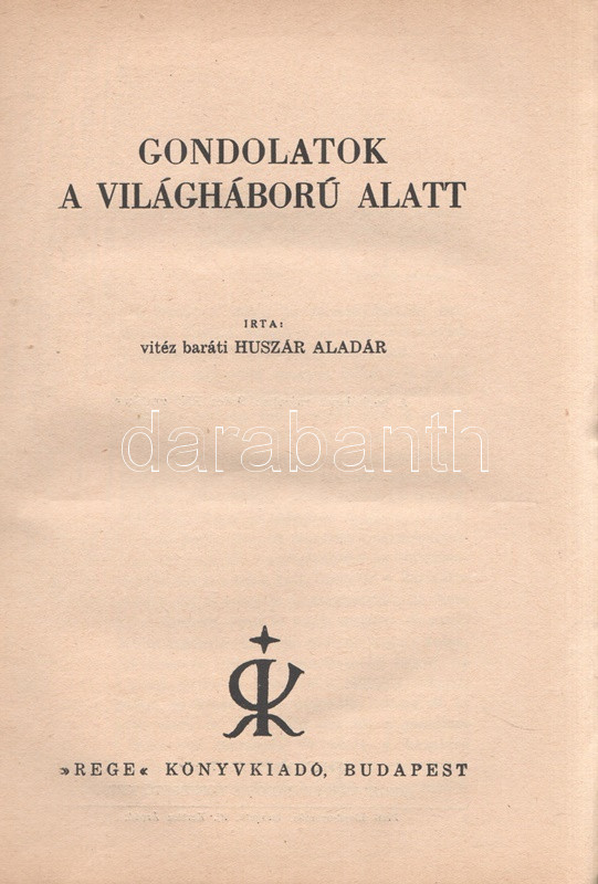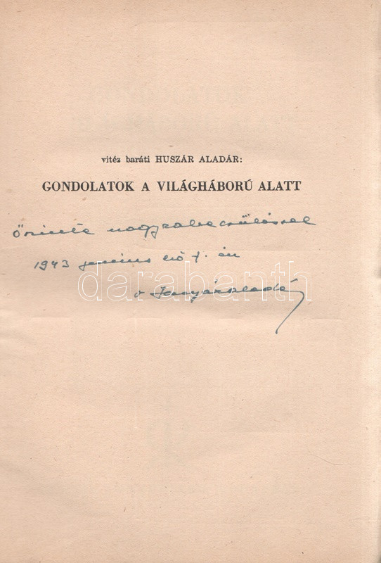 Huszár Aladár, vitéz baráthi: Gondolatok a világháború alatt. (Dedikált.) (Budapest, 1943. ,,Rege" Könyvkiadó és Terjesztő Kft. - Pesti Lloyd-nyomda). 336 p. Egyetlen kiadás. Dedikált: ,,Őszinte nagyrabecsüléssel 1943 június 8-án: v[itéz] Huszár Aladár". Huszár Aladár (1885-1945) jogász, politikus, több vármegye főispánja, Budapest főpolgármestere, az Országos Társadalombiztosítási Intézet igazgatója. A Bars megyei földbirtokos első világháborús frontszolgálata után Balassagyarmatra tért vissza, ahol tevékeny szerepet vállalt a város 1919. évi visszafoglalásában, illetve megjárta a proletárdiktatúra börtöneit. Később Nógrád, Hont, majd több más vármegye, Győr főispánja, majd 1932-től között Budapest főpolgármestere volt, egyben a vitézi rend gyakori szónoka. Gömbös Gyula miniszterelnökkel elmérgesedő viszonya miatt 1934-ben lemondott, és az OTI élére került. Németellenessége és nyilasellenessége már az 1930-as évektől közismert volt, az évtized végétől a ,,Magyar Nemzet" lap ,,Szellemi honvédelem" című rovatát vezetve élesen felszólalt a német befolyás és a nyilas törekvések ellen. Tekintélyes anyagismerettel, szenvedélyes hangon írt sajtóreplikái a magyar nemzeti hagyomány védelmében, a nyilas faj- és társadalomelmélet éles és kíméletlen kritikája jegyében születtek. Az országos hírű politikust, az OTI igazgatóját - a magyar politikai elit egy részével együtt - a Gestapo 1944-ben elhurcolta, a dachaui koncentrációs táborban hunyt el. Fűzve, kiadói borítóban, védőborító nélkül. Jó példány.