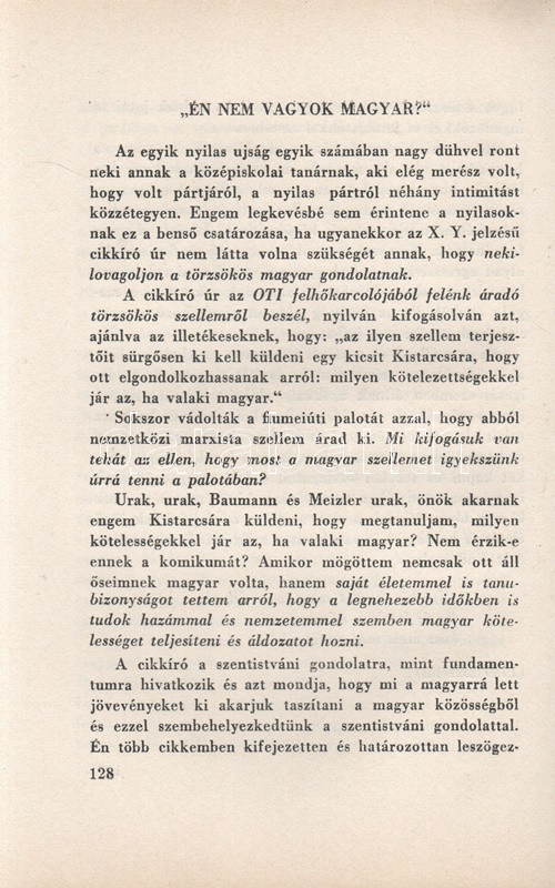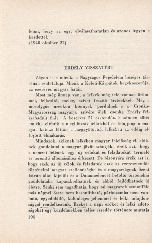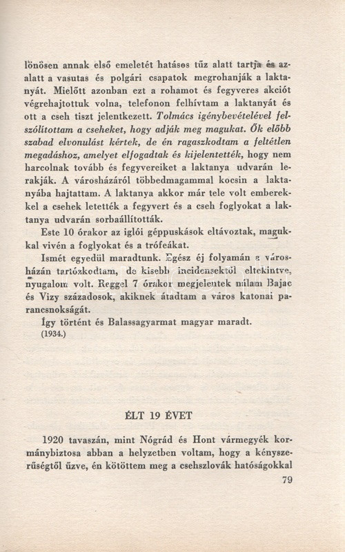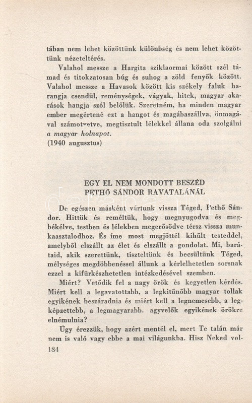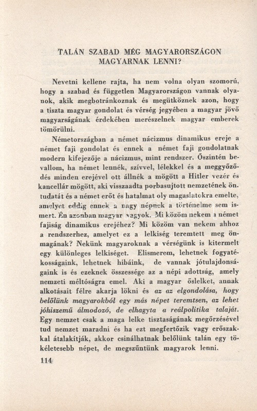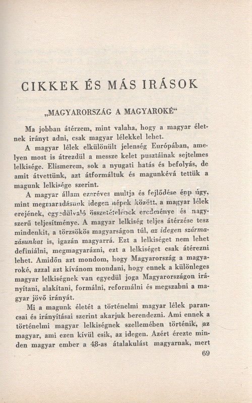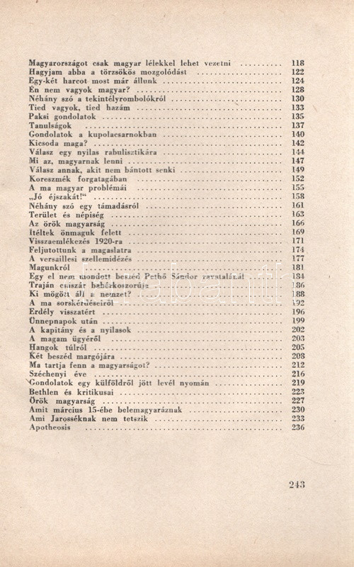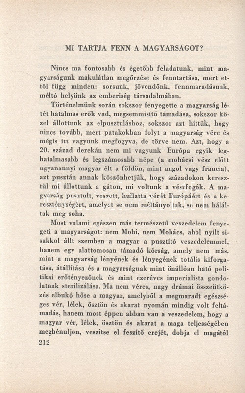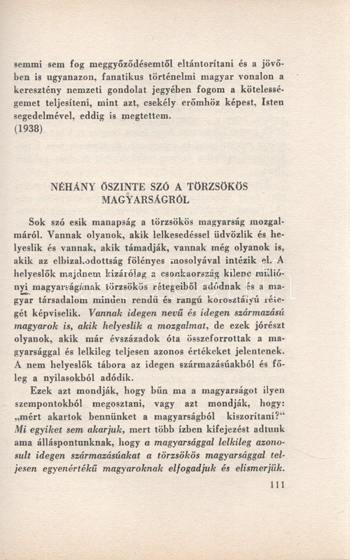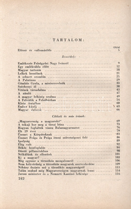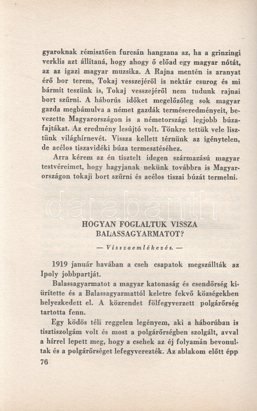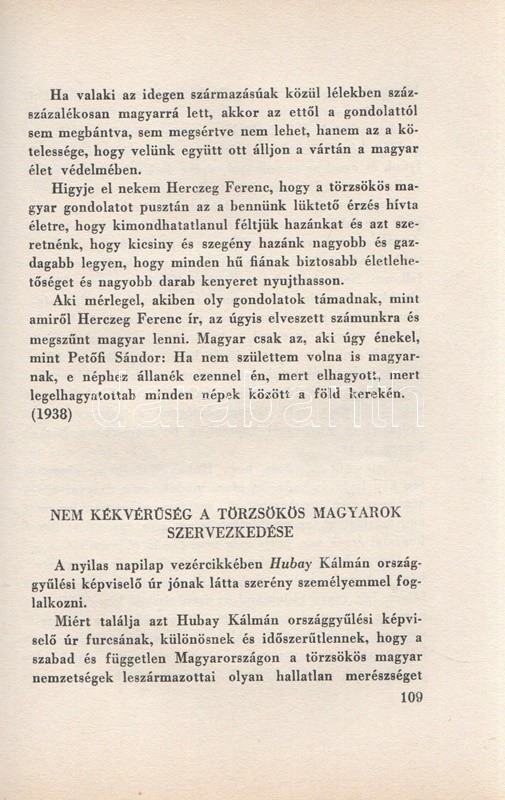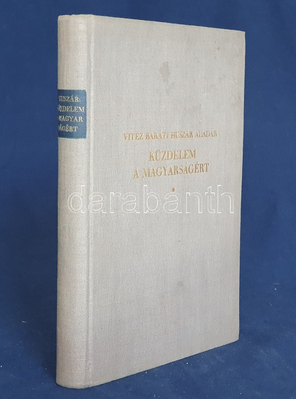 Huszár Aladár, vitéz baráthi: Küzdelem a magyarságért. Vitéz baráti Huszár Aladár beszédei és írásai. (Budapest, 1941) Hungária Kiadó Rt. (ny.) 243 + [1] p. Egyetlen kiadás. Huszár Aladár (1885-1945) jogász, politikus, több vármegye főispánja, Budapest főpolgármestere, az Országos Társadalombiztosítási Intézet igazgatója. A Bars megyei földbirtokos első világháborús frontszolgálata után Balassagyarmatra tért vissza, ahol tevékeny szerepet vállalt a város 1919. évi visszafoglalásában. Később Nógrád, Hont, majd több más vármegye, Győr főispánja, majd 1932-től között Budapest főpolgármestere volt, egyben a vitézi rend gyakori szónoka. Gömbös Gyula miniszterelnökkel elmérgesedő viszonya miatt 1934-ben lemondott, és az OTI élére került. Nemzetpolitikai beszédei, felszólalásai egy része zászlóavatásokon, országbővülések alkalmával hangzott el, kötete egy másik, markáns részét a nyilas sajtóval való írt éles szembeszállása alkotja. Az országos jelentőségű politikus és közszereplő a ,,Magyar Nemzet" lap ,,Szellemi honvédelem" rovatát vezette, mindvégig élesen fellépett a nyilas mozgalommal és a német érdekekkel szemben. 1944-ben a Gestapo elhurcolta. A tartalomból: Emlékezés Felsőgyőri Nagy Ivánról. A Madách Társaság ünnepi ülésén elmondott emlékbeszéd (1923) - Magyar tartozás. Bak község hősi emlékének leleplezési ünnepélyén elmondott beszéd (1928) - Gömbös Gyula, a miniszterelnök. Köszöntő a Társadalmi Egyesületek Szövetsége nevében - Széchenyi él... Emlék-serlegbeszéd a Nemzeti Kaszinó Széchenyi-lakomáján - Magyarország a magyaroké - Hogyan foglaltuk vissza Balassagyarmatot? - Üzenet Prága és Prága itteni szövetségesei felé - Nem kékvérűség a törzsökös magyarok szervezkedése - Talán szabad még Magyarországon magyarnak lenni? - Néhány szó egy támadásról - Egy el nem mondott beszéd Pethő Sándor ravatalánál - Mi tartja fenn a magyarságot? - Ami Jarosséknak nem tetszik. Aranyozott, enyhén foltos kiadói vászonkötésben. Jó példány.