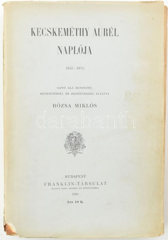 Kecskeméthy Aurél naplója 1851-1878. Sajtó alá rend., bevezetéssel és jegyzetekkel ellátta: Rózsa Miklós. Bp., 1909, Franklin-Társulat, LXIX+(3)+326+(2) p. Kiadói papírkötés, sérült borítóval, foltos, a fűzéstől elváló gerinccel.