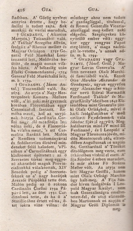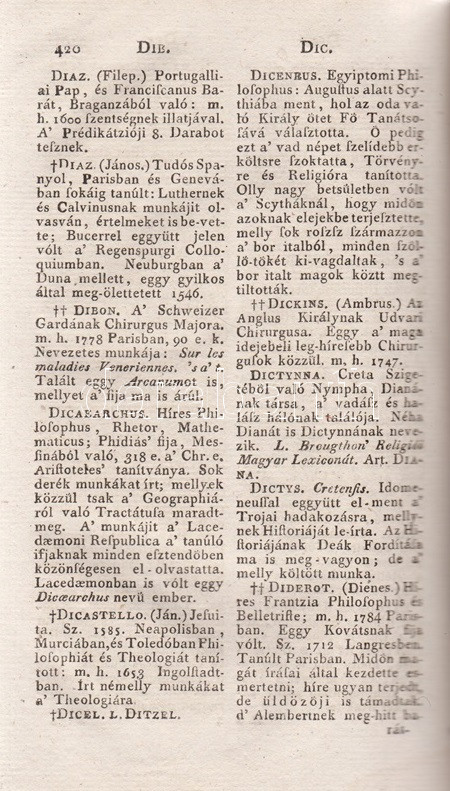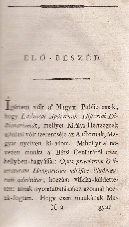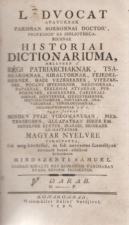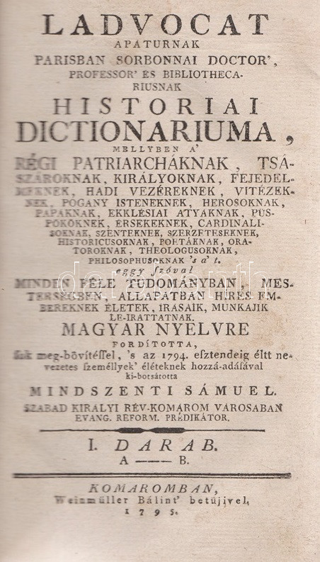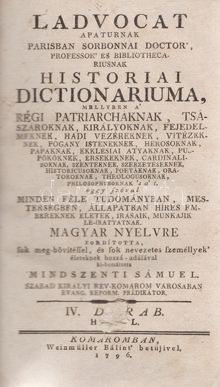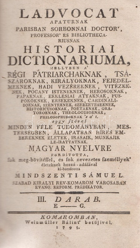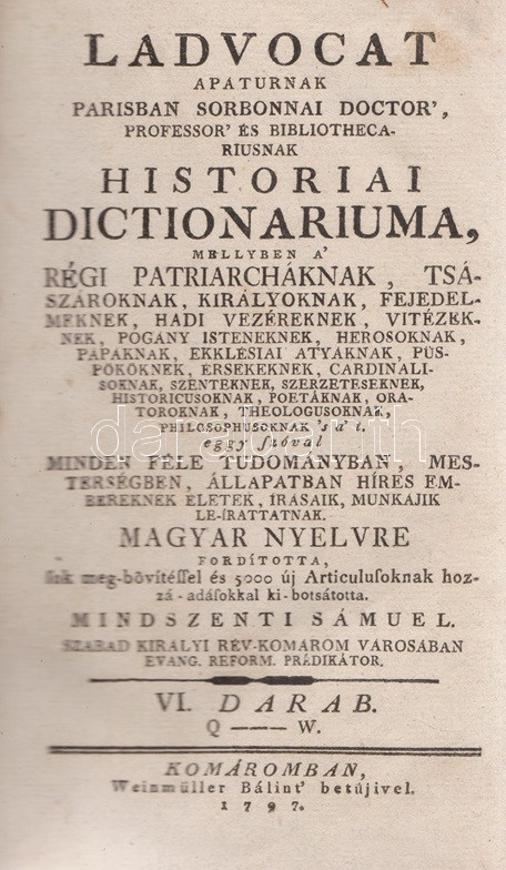 Ladvocat, [Jean-Baptiste] - Mindszenti Sámuel (ford.): Ladvocat apátúrnak [...] Historiai dictionariuma, mellyben a' régi patriarcháknak, tsászároknak, királyoknak, fejedelmeknek, hadi vezéreknek, vitézeknek, pogány isteneknek, herosoknak, pápáknak, ekklésiai atyáknak, püspököknek, érsekeknek, cardinalisoknak, szenteknek, szerzeteseknek, historicusoknak, poetáknak, oratoroknak, theologusoknak, philosophusoknak 's a' t, eggy szóval minden féle tudományban, mesterségben, állapatban híres embereknek életek, írásaik, munkájik le-írattatnak. Magyar nyelvre fordította, sok meg-bővítéssel, 's az 1794. esztendeig éltt nevezetes személlyek' életeknek hozzá-adásával ki-botsátotta Mindszenti Sámuel. I-VI. darab. [Hat kötet.] Komáromban, 1795-1797. Weinmüller Bálint' betűjivel. X + 596 p.; [2] + 483 + [1] p.; [2] + 470 p.; [2] + 514 p.; [2] + 662 p.; [8] + 623 + [1] p. Tételünk a magyar nyelven megjelent egyik legkorábbi életrajzi enciklopédia, amely a külföldi és magyar históriai személyiségek életrajzait gyűjti össze. A magyar mű Jean-Baptiste Ladvocat ókortudós, a párizsi Sorbonne könyvtárosának (1709-1765) alapos munkáján alapszik, amely alfabetikus sorrendben sorakoztatja a mitológiai szereplők, a bibliai személyek, az ókori, középkori és újkori uralkodók, hadvezérek, pápák, szentek és szerzetesek, reformátorok és szabadságharcosok, udvaroncok, írók, csillagászok, természetfilozófusok és mérnökök, festők és zenészek, felfedezők, kalandorok és pamfletírók, filozófusok, tudomány-rendszerezők, politikusok, nyomdászok és tipográfusok életrajzait. A munkát Mindszenti Sámuel (1751-1806) református lelkész, a Komáromi Tudós Társaság tagja, a Mindenes Gyűjtemény szerkesztője fordította. Az eredeti életrajz-gyűjteményen enyhe nyugat-európai fókusz érződik, ám ez főként az írók, költők, filozófusok és festők terén érvényesül, uralkodók és hadvezérek tekintetében a sorozat bőségesen tartalmaz lengyel, orosz, oszmán, svéd és egyéb nem nyugat-európai életrajzokat is, a magyar szerkesztő által megbővített magyar névanyag mellett. A magyar felvilágosodás fontos évtizedében keletkezett komáromi fordítás igen érdekes szempontot ad arra nézvést, hogy a magyar névanyagból: a magyar történelmi, tudományos és írói világból kik kerülhettek be a lexikonba. Uralkodóink tekintetében bőséges a kínálat, Mátyás király hosszú szócikket kap, hozzá hasonlóan hosszút a Habsburg I. Lipót, Mária Terézia, az erdélyi Bethlen Gábor és Rákóczi Ferenc. A magyar irodalmiságból Pázmány Péter, Bethlen Miklós és Bethlen Kata önéletíró, Rákóczi Ferenc, a kortársak közül Gvadányi József nyugalmazott lovassági tábornok, valamint Teleki József műgyűjtő, utazó és levelező főrend került be a lexikonba, de különös módon Károli Gáspár, Heltai Gáspár, Balassi Bálint, Rimay János, Zrínyi Miklós, Gyöngyösi István szerzői életrajza hiányzik, a közel kortársak közül pedig a valóságban rendkívüli könyvsikereket maga mögött tudó Dugonics András híre nem jutott el a szerkesztőhöz, a kor egyik főszereplője, Kazinczy Ferinc pedig csak mint Shakespeare-fordító szerepel a kötetekben. A honi tudományosságot Apáczai Csere János, Bod Péter és Czvittinger Dávid helyett Antonio Bonfini, Galeotto Marzio, a fent említett Pázmány Péter, Bél Mátyás polihisztor és Hell Miksa csillagász képviseli, a fordítóhoz hasonlóan szerkesztőnek állt hírlapírók, a deákos költők és a magyar felvilágosodás fontos nyelvészei és újságírói viszont nem szerepelnek a kötetben. A rendkívül ízes nyelven fordított mű enyhén felvilágosult szellemet tükröz, francia filozófusokból igen erős a kínálat: Pascal és Descartes, Montesqueiu, Rousseau és Voltaire éppúgy szerepel a műben, mint az enciklopédistákat fémjelző Diderot és Helvétius. A kötet naprakészségét jelzi, hogy XVI. Lajos sorsát egészen a kivégzésig követi, a francia forradalomnak ugyanakkor csak áldozatai kerülnek a műbe, politikai vezérei nem (nem lehetetlen, hogy cenzurális okokból), egyes radikális filozófusoknak pedig inkább megnyerő modorát, jellemét és tánctehetségét inkább tárgyalja a mű, mint politikai jelentőségét. A hatodik kötetben W-vel kezdődő szócikkekig eljutó munkának 1808-1809-ban megjelent két pótkötete, szintén Mindszenti Sámuel gondozásában. A negyedik és ötödik kötet címlevelén apró hiány, a második kötet egy ívének levelein apró, a szövegtükröt nem érintő szúrágásnyom, a hatodik kötet első előzéke részben hiányzik. Egységes, öt bordára fűzött, aranyozott, enyhén sérült, enyhén hiányos gerincű kiadói félbőr kötésben, vörös festésű lapszélekkel, kézzel festett előzékekkel. Az 1., 5. és 6. kötet gerincén apró szúrágásnyomok, az 1. és 3. kötet első, az 5. kötet hátsó kötéstáblájának papírborítása hiányzik, a 3, 4., 5., 6. kötet egy-egy kötéstáblájának papírborítása sérült. Összességében jó példány.