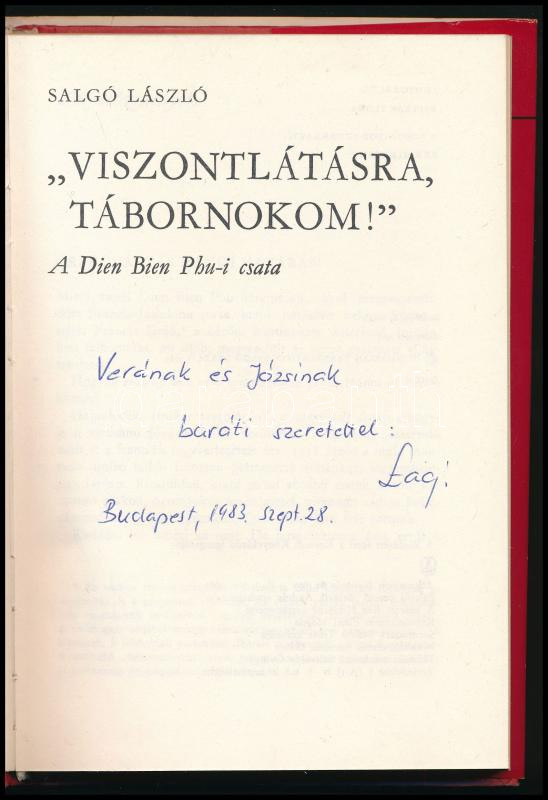 Salgó László: "Viszontlátásra, tábornokom!" A Dien Bien Phu-i csata. A szerző,Salgó László (1921-1993) újságíró, történész, a Magyar Rádió főmunkatársa által Kolek Vera, a rádió riportere részére DEDIKÁLT példány! Benne Salgó László névjegykártyájával. Népszerű Történelem. Bp., 1983., Kossuth. Kiadói kartonált papírkötés, kiadói papír védőborítóban.