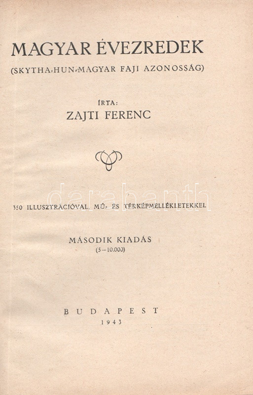 Zajti Ferenc: Magyar évezredek. (Skytha-hun-magyar faji azonosság.) 350 illusztrációval, mű- és térképmellékletekkel. Budapest, 1943. (Móricz Zsigmond könyvkiadóvállalat - ,,Pátria"-Nyomda Rt.) 1 t. (címkép) + XII + 443 + [1] p. + 31 t. (ebből 5 kihajtható 26 kétoldalas,) + 3 térkép (kihajtható). A szkíta-hun-magyar leszármazás és a szkítasági népek egyedülálló kultúrateremtő mivolta mellett érvelő őstörténeti munkát oldalszámozáson belül számos szövegközti és egész oldalas felvétel, térképvázlat illusztrálja. A mű első kiadása 1939-ben jelent meg. 1940-ben (a szerző állítása szerint) a Vallás- és Közoktatásügyi Minisztérium a munkát a tanári könyvtárak részére beszerzendővé nyilvánította. A mű szerepel az Ideiglenes Nemzeti Kormány által 1945-ben betiltott könyvek jegyzékén. Kiadói, aranyozott gerincű, első kötéstábláján illusztrált félvászon kötésben, eredeti, színes, illusztrált, enyhén sérült védőborítóban. Szép példány.