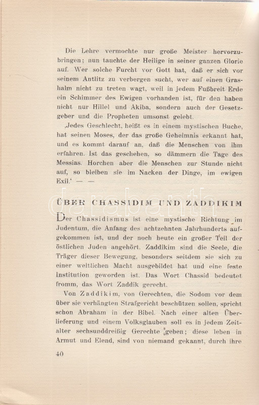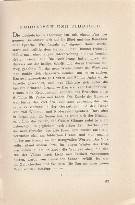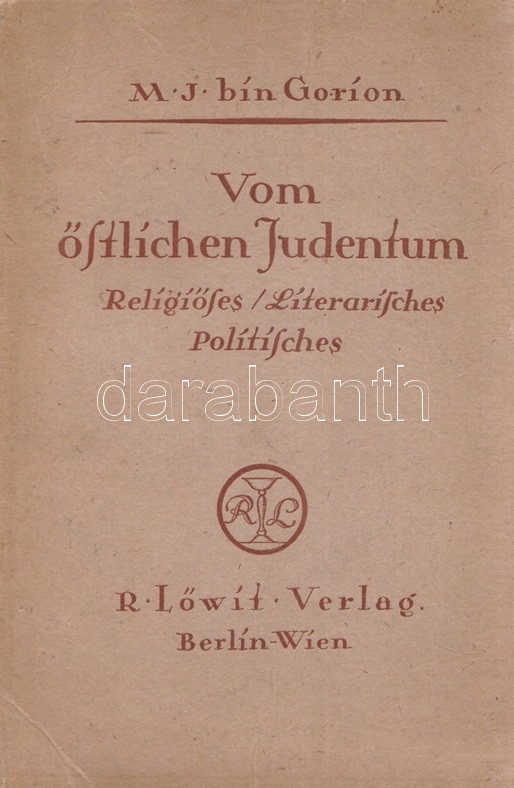 Bin Gorion, M[icha] J[osef]: Vom östlichen Judentum: religiöses, Literarisches, Politisches. Berlin-Wien, 1918. R. Lövit Verlag (Druck F. Rollinger, Wien). 97 + [3] p. Első kiadás. A német nyelvű munka a kelet-európai zsidóság életmódjának, vallási és kulturális hagyományainak, és politikai terveinek részleteit járja körül, a kötet végén külön kitérve az oroszországi zsidóság helyzetére. A címoldalon régi tulajdonosi bejegyzés. Sérült, hiányos gerincű kiadói kartonkötésben.