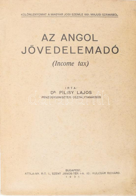 Dr. Pilisy Lajos: Az angol jövedelemadó. (Income tax). Különlenyomat a... https://www.darabanth.com/en/466-Online-auction/466.0/Books/Books-Law~500049/Dr-Pilisy-Lajos-Az-angol-jovedelemado-Income-tax-Kulonlenyomat-a-Magyar-Jogi-Szemle-1931-~II3077855