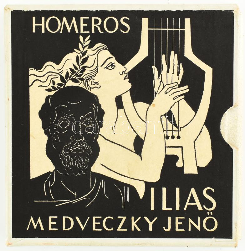 Medveczky Jenő: Homeros - Ilias. (Minikönyv). Bp., 1973, Képzőművészeti Alap. Egészoldalas, fekete-fehér illusztrációkkal. Magyar, angol és német nyelven. Kiadói műbőr-kötés, kiadói kartontokban.