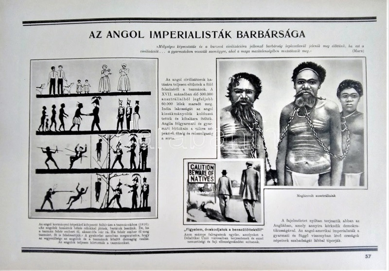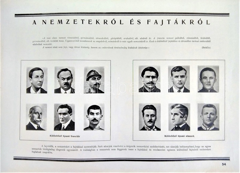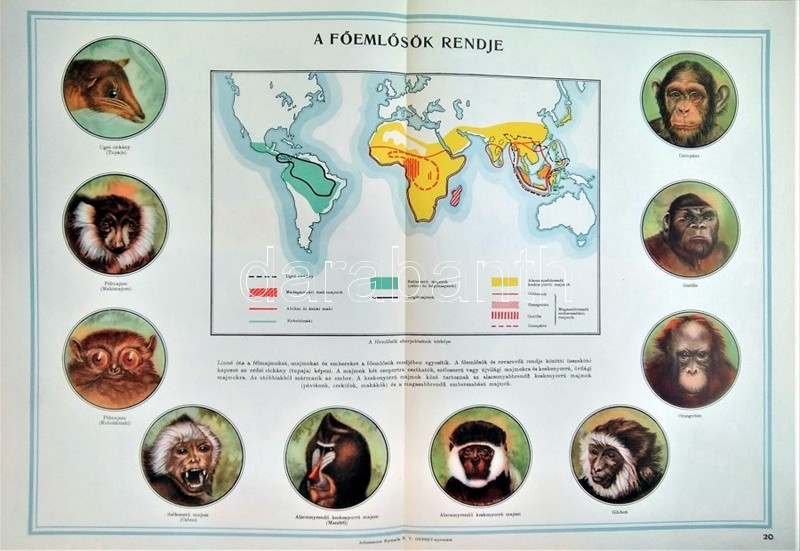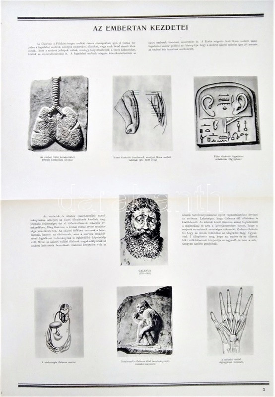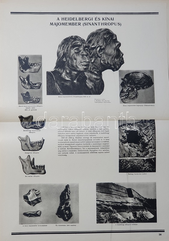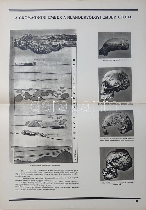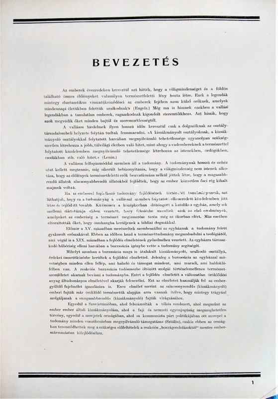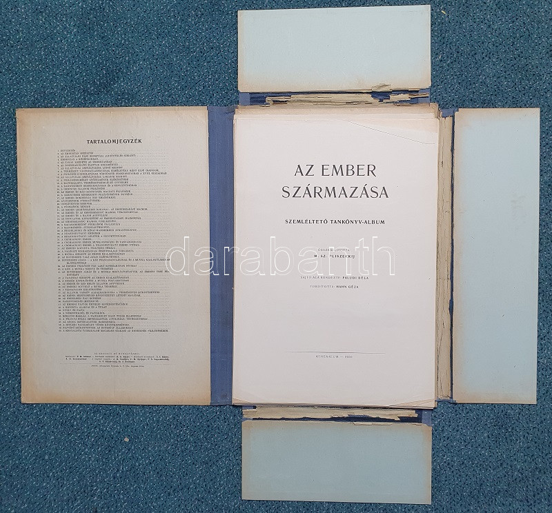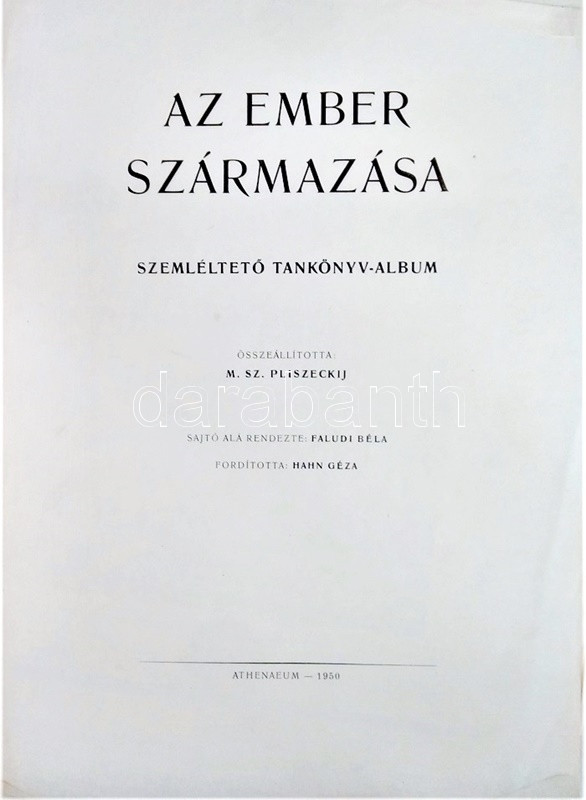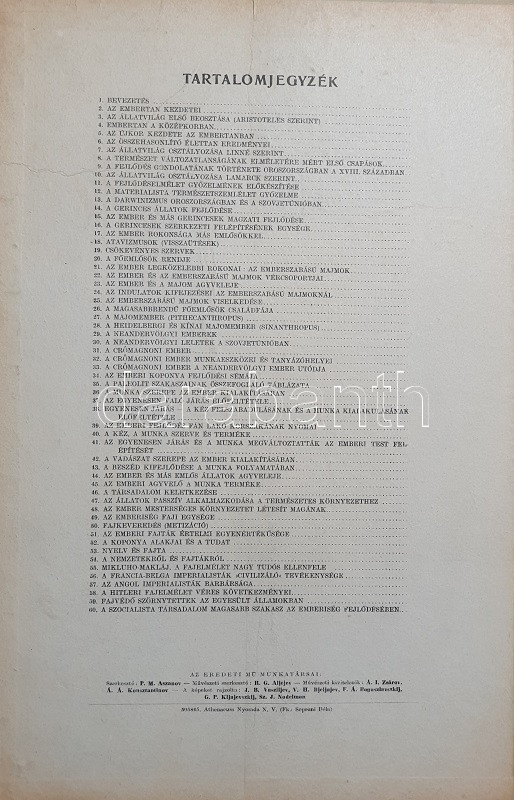 Az ember származása. SzemléltetÅ‘ tankönyv-album. ÖsszeállÃtotta: M. Sz. Pliszeckij. Sajtó alá rendezte: Faludi Béla. FordÃtotta: Hahn Géza. (Budapest), 1950. Athenaeum (ny.) 60 t. (melybÅ‘l egy szÃnes). Folio. Kiadványunk a darwini fejlÅ‘déselmélet mellett érvel, kiemeli az evolúció-elmélethez vezetÅ‘ tudományos fejlÅ‘dés egyes állomásait, bemutatja az emberi faj egységességét. Az utolsó négy tábla a (brit, francia, német, amerikai) imperialista világot fajvédÅ‘ jellegű hatalomként, a Szovjetuniót pedig a társadalom magasabb rendű szakaszaként mutatja be. StÃlusmutatvány a kiadványból: ,,Ha az emberrel foglalkozó tudomány fejlÅ‘désének történetét tanulmányozzuk, azt láthatjuk, hogy ez a tudományág a vallással szemben folytatott elkeseredett küzdelemben jött létre és fejlÅ‘dött tovább. Különösen a középkorban dühöngött a katolikus egyház [!], amelynek szellemi diktatúrája ahhoz vezetett, hogy feledésbe merültek azok az elsÅ‘ eredmények, amelyeket az emberiség a természet megismerése terén még az ókorban elért. [...] Mihelyt azonban a burzsoázia maga is átalakult kizsákmányoló, uralkodó osztállyá, érdekei összeütközésbe kerültek a fejlÅ‘dési elmélettel. Jelenleg a burzsoázia az egyházzal szövetségben minden ellen fellép, ami haladó, és támogat mindent, ami maradi [...]. A reakciós burzsoázia tudósmezbe öltözött szolgái történelemellenes természetszemléletet akarnak bevinni a tudományba. [...] Egyedül a Szovjetúnióban, ahol felszámolták a tÅ‘kés rendszert, ahol megszűnt az ember ember általi kizsákmányolása [!], ahol a faji és nemzeti egyenjogúság [!] megszeghetetlen törvény [...] csakis ebben az országban teremtÅ‘dhettek meg a szükséges elÅ‘feltételek a reakciós ,,hozzágondolásoktól" mentes ember-származástan kifejlÅ‘déséhez." A kihajtható táblák mérete: 590x420 mm, az egészoldalas tábláké: 590x420 mm. Jó állapotú lapok, feliratozott, kiadói félvászon mappában. Jó példány.