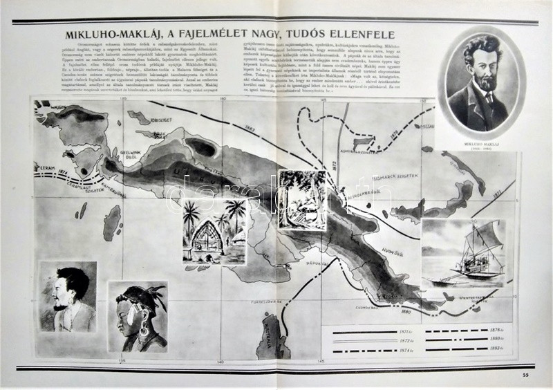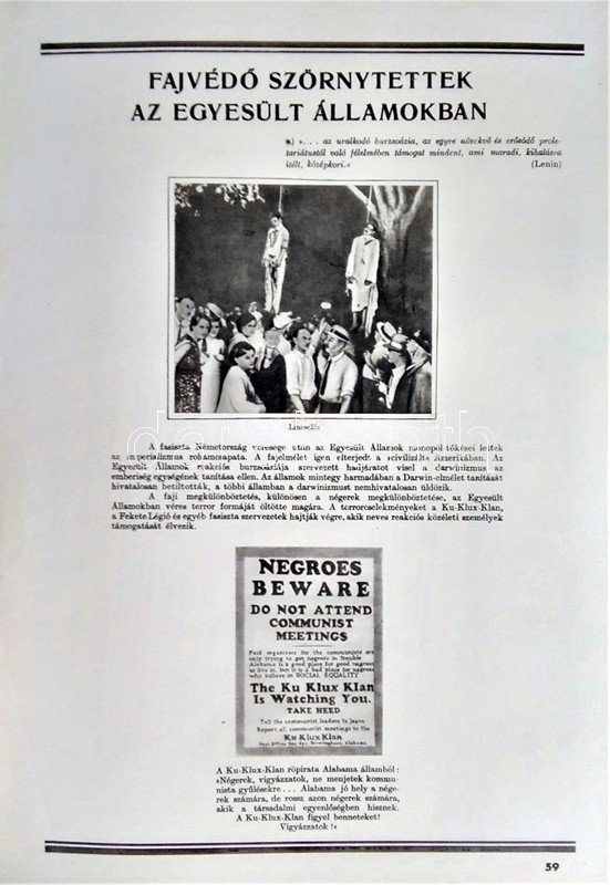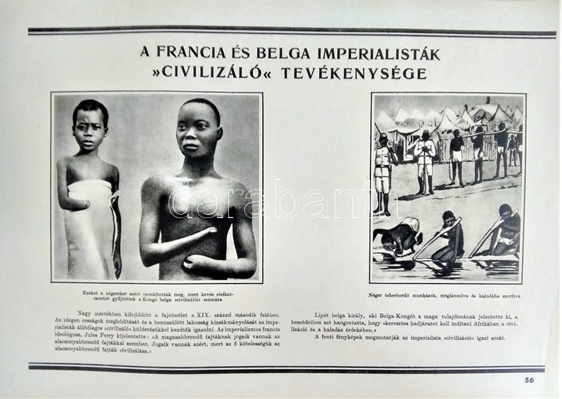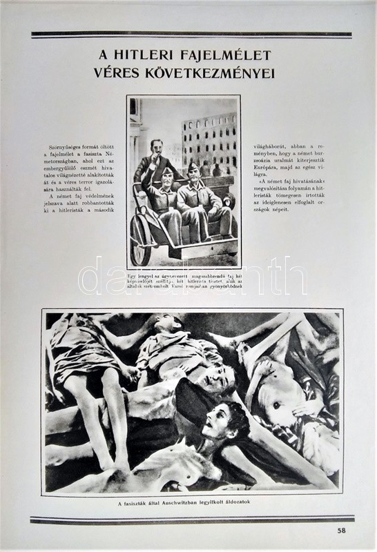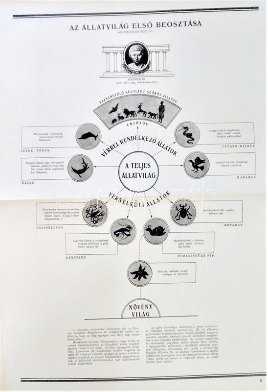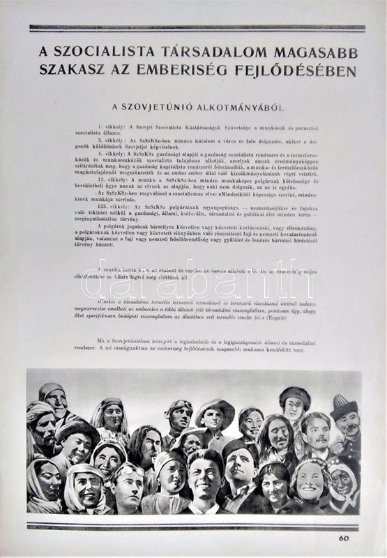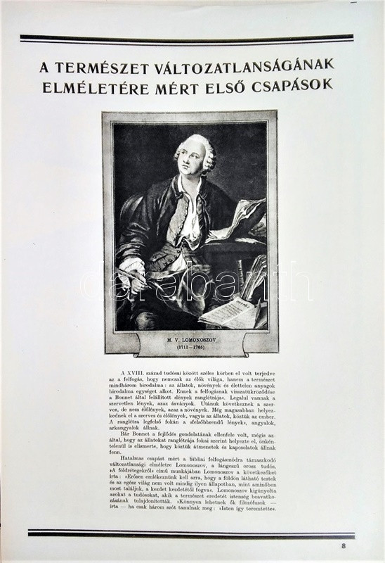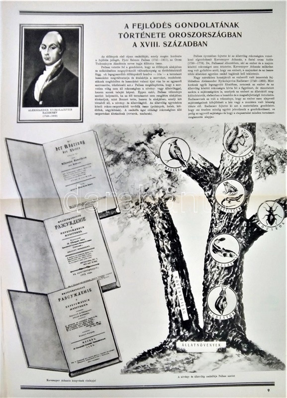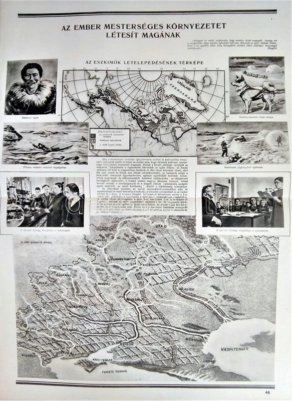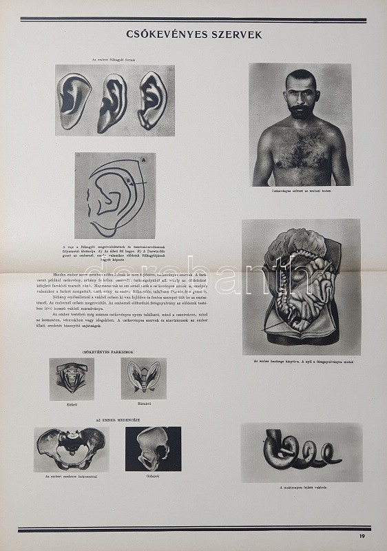 Az ember származása. SzemléltetÅ‘ tankönyv-album. ÖsszeállÃtotta: M. Sz. Pliszeckij. Sajtó alá rendezte: Faludi Béla. FordÃtotta: Hahn Géza. (Budapest), 1950. Athenaeum (ny.) 60 t. (melybÅ‘l egy szÃnes). Folio. Kiadványunk a darwini fejlÅ‘déselmélet mellett érvel, kiemeli az evolúció-elmélethez vezetÅ‘ tudományos fejlÅ‘dés egyes állomásait, bemutatja az emberi faj egységességét. Az utolsó négy tábla a (brit, francia, német, amerikai) imperialista világot fajvédÅ‘ jellegű hatalomként, a Szovjetuniót pedig a társadalom magasabb rendű szakaszaként mutatja be. StÃlusmutatvány a kiadványból: ,,Ha az emberrel foglalkozó tudomány fejlÅ‘désének történetét tanulmányozzuk, azt láthatjuk, hogy ez a tudományág a vallással szemben folytatott elkeseredett küzdelemben jött létre és fejlÅ‘dött tovább. Különösen a középkorban dühöngött a katolikus egyház [!], amelynek szellemi diktatúrája ahhoz vezetett, hogy feledésbe merültek azok az elsÅ‘ eredmények, amelyeket az emberiség a természet megismerése terén még az ókorban elért. [...] Mihelyt azonban a burzsoázia maga is átalakult kizsákmányoló, uralkodó osztállyá, érdekei összeütközésbe kerültek a fejlÅ‘dési elmélettel. Jelenleg a burzsoázia az egyházzal szövetségben minden ellen fellép, ami haladó, és támogat mindent, ami maradi [...]. A reakciós burzsoázia tudósmezbe öltözött szolgái történelemellenes természetszemléletet akarnak bevinni a tudományba. [...] Egyedül a Szovjetúnióban, ahol felszámolták a tÅ‘kés rendszert, ahol megszűnt az ember ember általi kizsákmányolása [!], ahol a faji és nemzeti egyenjogúság [!] megszeghetetlen törvény [...] csakis ebben az országban teremtÅ‘dhettek meg a szükséges elÅ‘feltételek a reakciós ,,hozzágondolásoktól" mentes ember-származástan kifejlÅ‘déséhez." A kihajtható táblák mérete: 590x420 mm, az egészoldalas tábláké: 590x420 mm. Jó állapotú lapok, feliratozott, kiadói félvászon mappában. Jó példány.