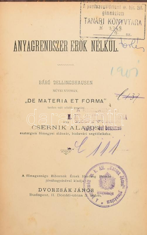 Csernik Alajos: Anyagrendszer erők nélkül. Bp.,én.,Dvorzsák János, 217+5 p. Átkötött félvászon-kötés, kissé kopott borítóval, intézményi bélyegzésekkel.