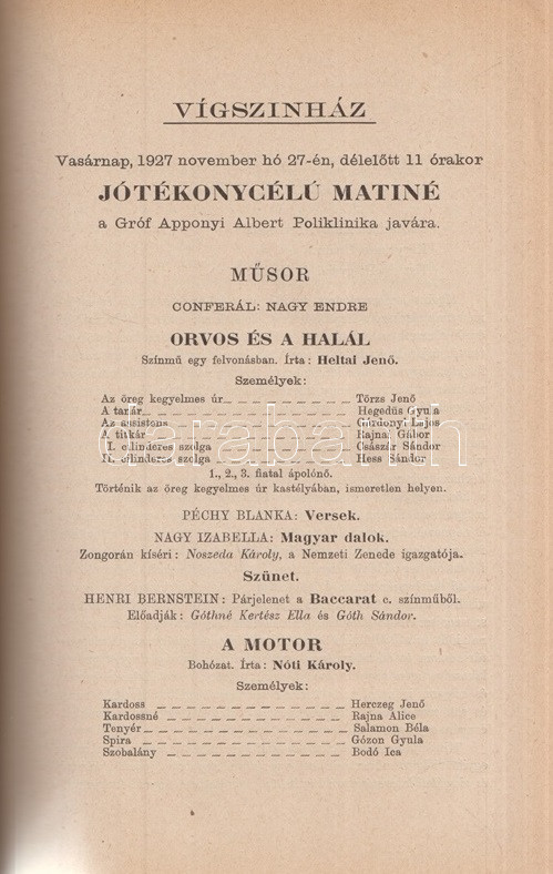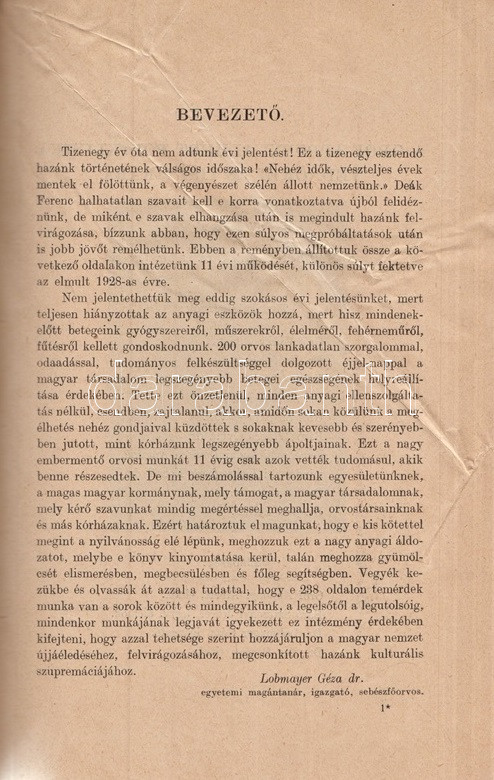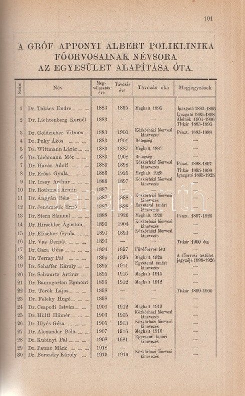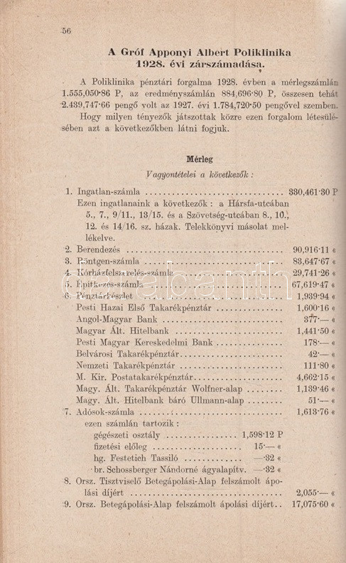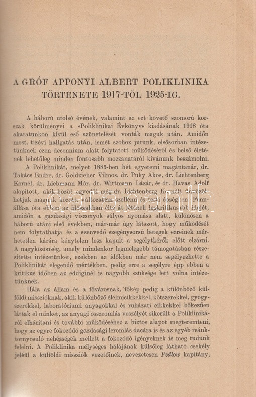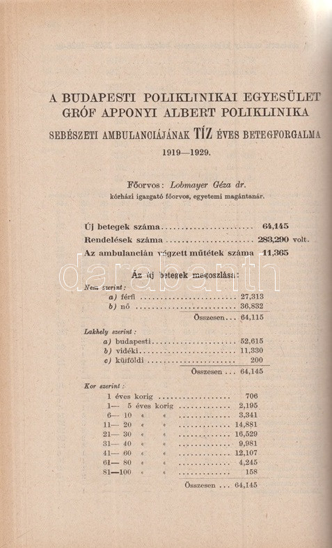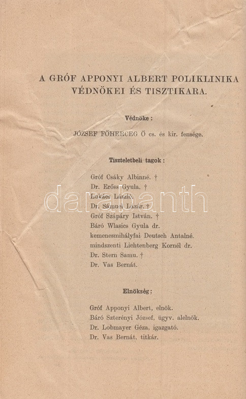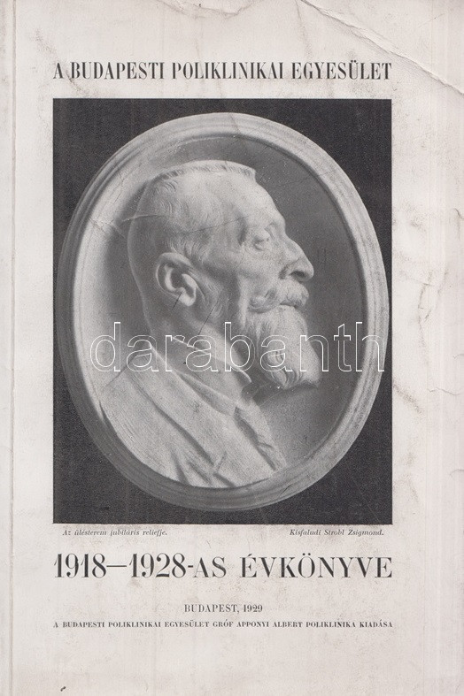 Évkönyv a Budapesti Poliklinikai Egyesület gróf Apponyi Albert Poliklinika 1918-1928. évi működéséről. Szerkeszti Lobmayer Géza. Budapest, 1929. Budapesti Poliklinika gróf Apponyi Albert Poliklinika (Franklin-Társulat ny.) 238 + [2] p. + 16 t. Beszámoló az 1887-ben alapított Budapesti Poliklinikai Egyesület elmúlt tíz évéről. A VII. kerületi intézmény 1921-ben vette fel egyik neves támogatója, Apponyi Albert nevét. Az egészségügyi intézmény sokirányú fejlesztéséről írott összefoglalókat igazgatóságtanácsi beszámolók, mérlegfőkönyvek váltják, a kötet második felében részletes adattár a közintézmény betegeiről, mely kórisméjükön és gyógykezelésükön kívül foglalkozási körüket is közli. Ez utóbbi jól igazolja a poliklinikával kapcsolatos közvélekedést, miszerint az Apponyi nevével fémjelzett intézmény a szegényebb rétegek gondozójának számított. A kötet végén megemlékezések a poliklinika volt egyéniségeiről. A címlapon apró szakadásnyom, az első ív néhány levelén enyhe gyűrődés. Fűzve, illusztrált, enyhén gyűrött kiadói borítóban. Jó példány.