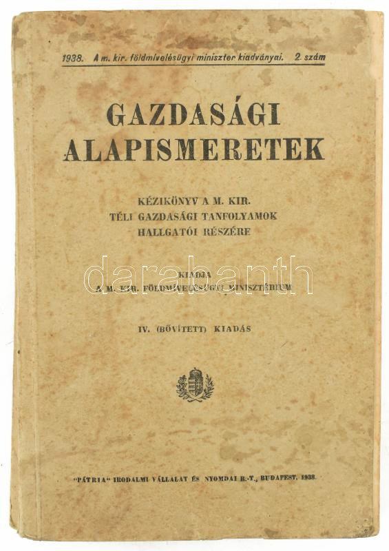 Gazdasági alapismeretek. Kézikönyv a m. kir. téli gazdasági tanfolyamok hallgatói részére. A m. kir. földmívelésügyi miniszter kiadványai 2. sz. Bp., 1938, Pátria, 479 p. Fekete-fehér képekkel, ábrákkal illusztrált. Kiadói kartonált papírkötés, kopottas, foltos, a könyvtesttől nagyrészt elvált borítóval, helyenként kissé foltos, sérült lapokkal.