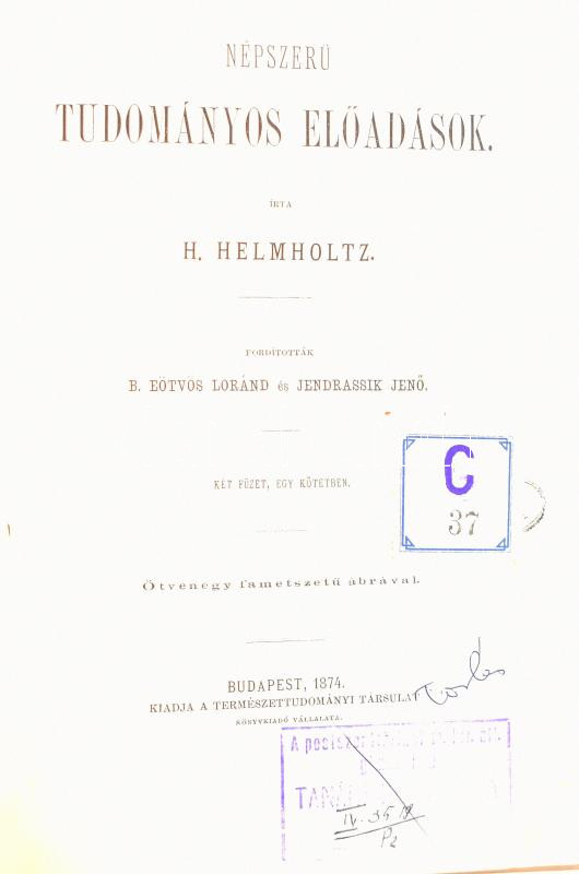 Helmholtz, H[ermann]: Népszerű tudományos előadások. 1-2. füzet. Fordították B. Eötvös Loránd és Jendrassik Jenő. A Kir. Magyar Természettudományi Társulat Könyvkiadó Vállalata VI. köt. Bp., 1874, Kir. M. Természettudományi Társulat, XI+1+389+1 p. Szövegközti és egészoldalas illusztrációkkal. Korabeli átkötött félbőr-kötés, kopott borítóval, régi könyvtári példány, a gerincen címkével, régi intézményi bélyegzésekkel, kissé foltos lapokkal.