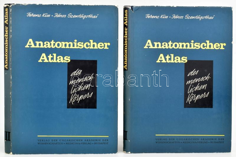 Kiss, Ferenc - Szentágothai, János: Anatomischer Atlas des menschlichen Körpers 2-3. Bände. Bp., 1974, Akadémiai - Medicina. Német és latin nyelven. Kiadói foltos egészvászon-kötés, kiadói kopott papír védőborítóban.